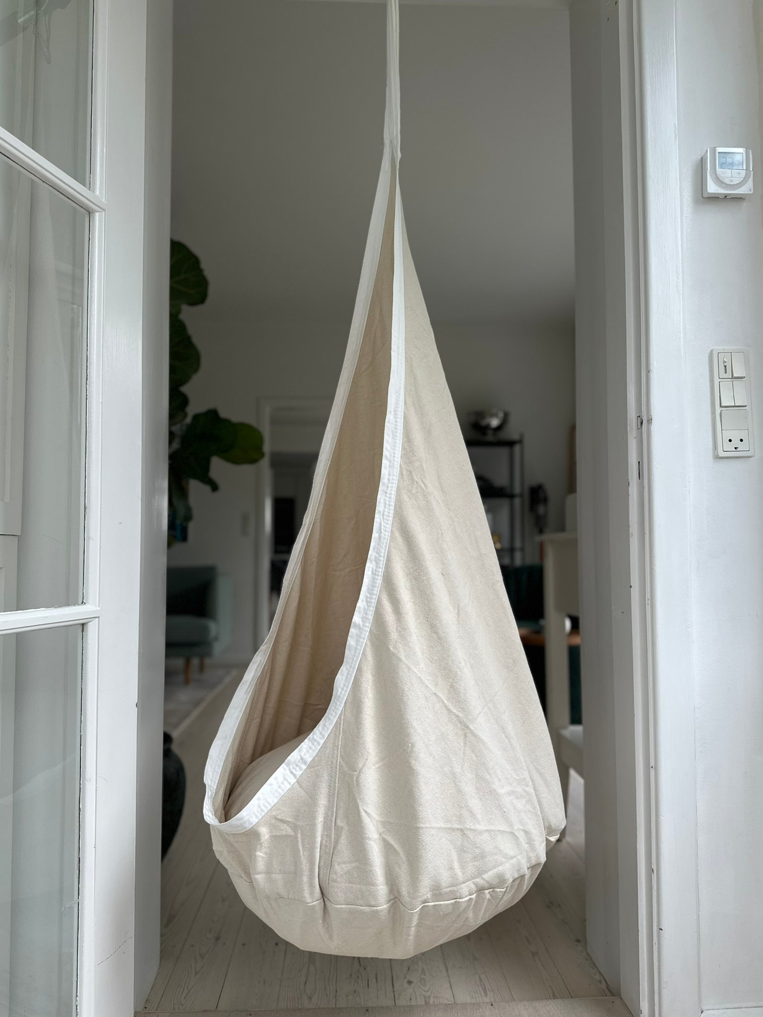 Vores smukke hængehule i beige med hvid kant er en drøm af et frirum til børn. Den er perfekt til både leg, hygge og ro. Den er lavet i 100% bomuld og det svævende design, skaber en tryg lille oase, hvor dit barn kan trække sig tilbage og finde ro midt i hverdagens tempo.